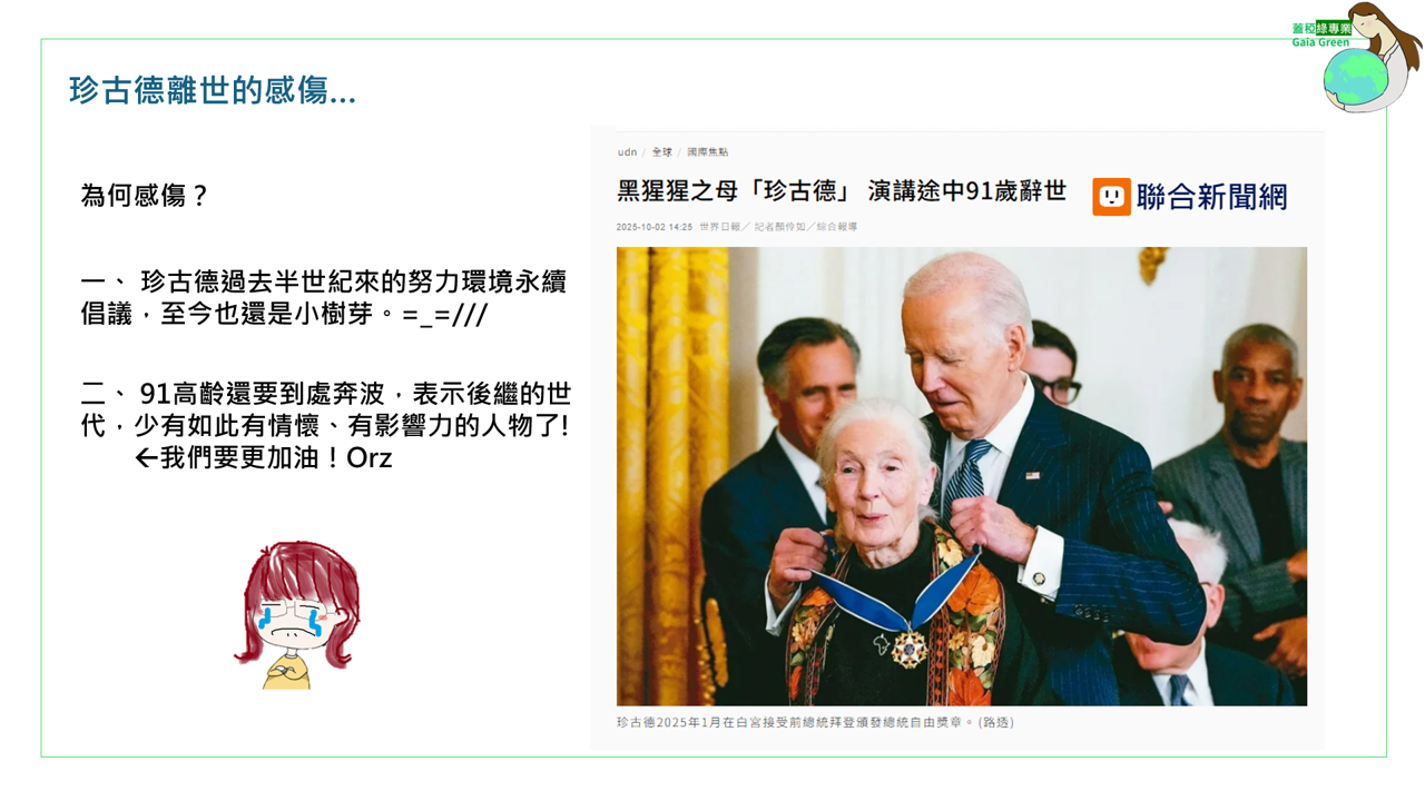 珍古德離世的感傷… / 綠時事, 綠顧問360.全方位賦能陪跑計畫 / 作者: 卿惠博士 Dr. Chinghui 珍古德過世了,在她美國巡迴演講的途中。RIP 有點感傷,因為我們這個世界,還需要讓91歲的長者,到處巡迴演講進行環境永續倡議。 (今年六月才剛來過台灣,老天鵝,91歲還需要如此跨國奔波啊!!) 這表示什麼? 一.珍古德過去半世紀來的努力倡議,至今也還是小樹芽。 二.91高齡還要到處奔波,表示後繼的世代,少有如此有情懷、有影響力的人物了! 不管哪個,都挺令人感傷的….Orz 珍古德的過世,是上一代環境人的接棒。 我們這代,也要接起棒來,持續加油!! ‧ #希望我91歲時後繼有一群人,不需要老身親自奔波 #我是哪來的自信可以活到91歲XD #應該是要希望環境倡議早日成功才對